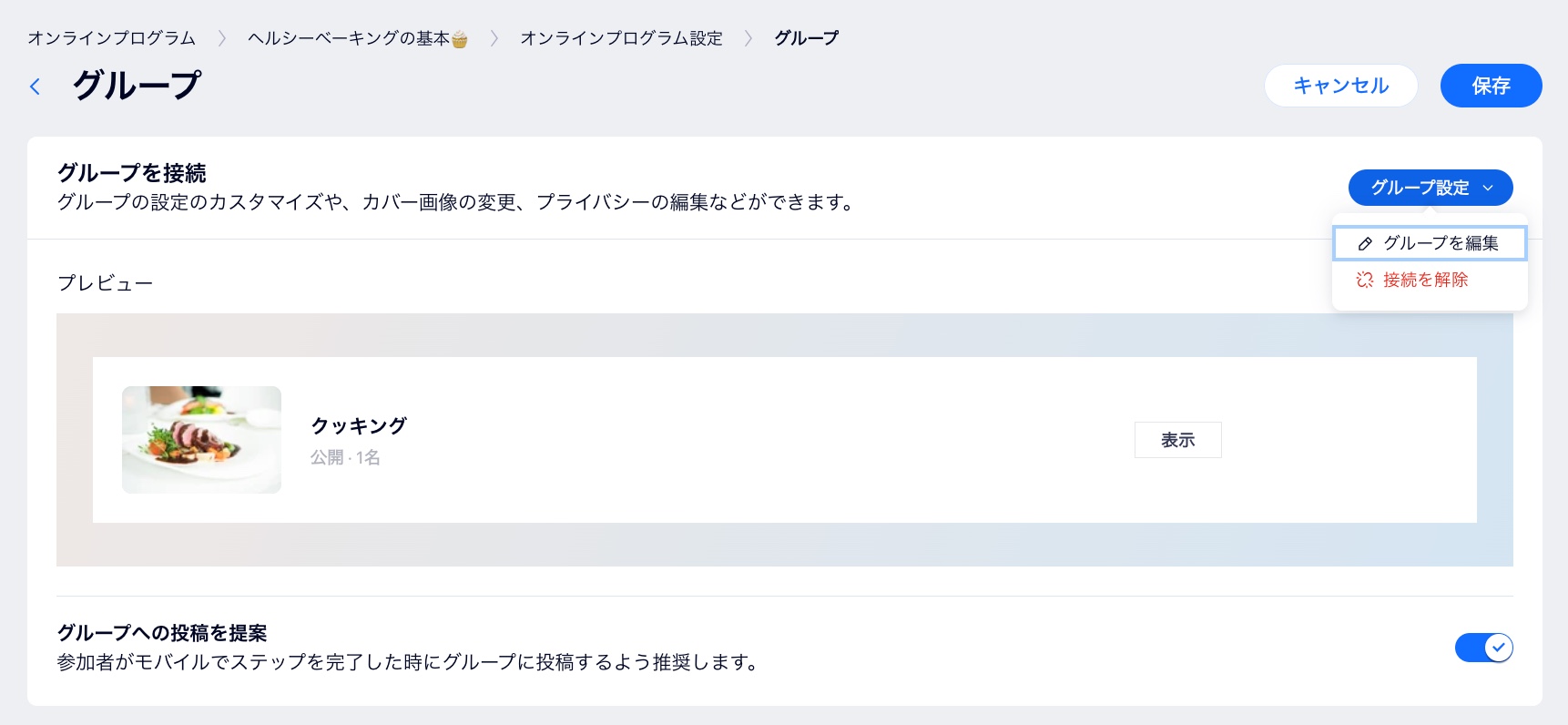 新しいオンラインプログラムは下書きとして保存され、カスタマイズできる状態になります。メンバーにオンラインプログラムを紹介し、参加料金を設定し、自分のペースのプログラムまたは既定のペースのプログラムから選択します。また、グループを接続し、参加者にバッジや認定証を割り当てることもできます。