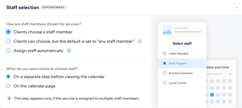 Decide how clients book with your staff, so your scheduling works for you. Let clients pick a staff member, assign staff automatically, or set a default for each service.