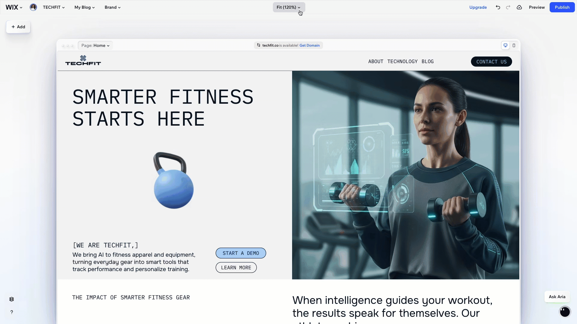 When selecting an element, you can also click Ask AI on the action bar for tailored prompt suggestions. Ask Aria to move sections, generate a new design, fix layout issues, or improve section text—all with a simple command. If you need to make more changes, just send another message to Aria right in the chat.