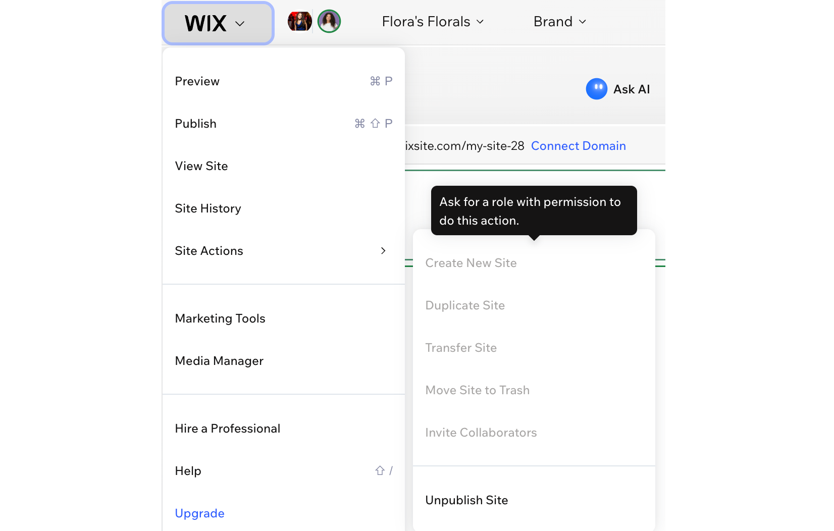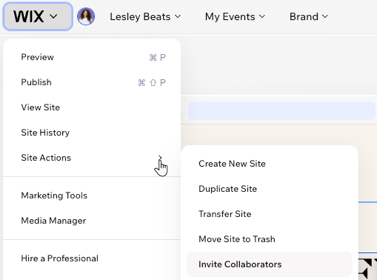 You can invite people to collaborate while you're working in your editor – no need to open the dashboard. Click the Wix icon at the top left, hover over Site Actions and select Invite Collaborators.