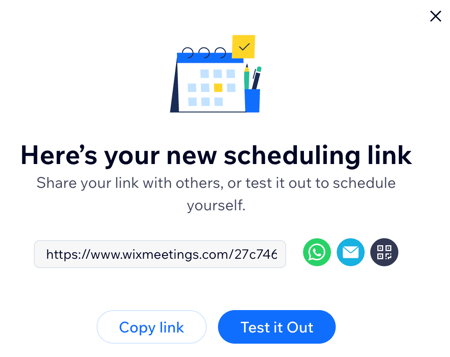 After saving, you can share, copy, or test your new scheduling link from the pop-up.