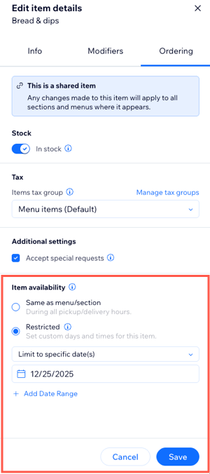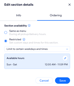 - Choose when to set your section or item availability: