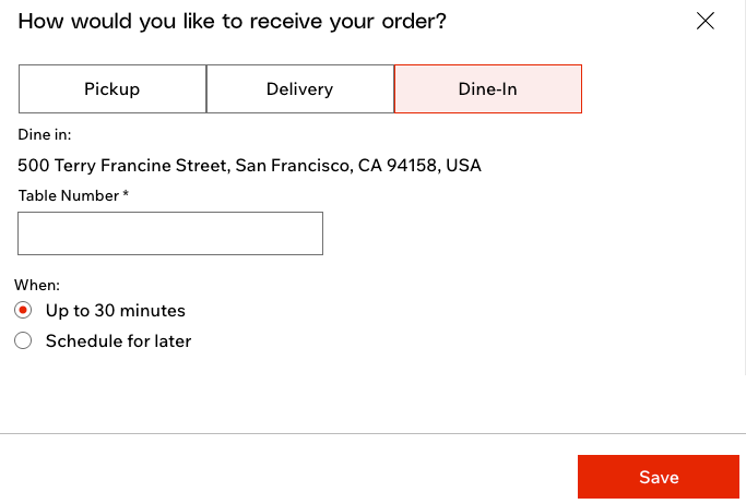 - Dine-in settings: Enter instructions for your customers to see when they place a dine-in order. For example, share how customers can get their order once it's ready. You can also require the customer's seating information (their table number, room number or your own requirement).