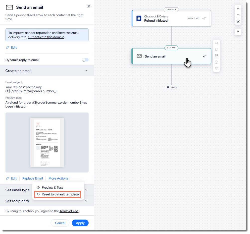 When actions occur in your store (e.g. a customer places an order, receives a refund, or their order status changes), emails are triggered and sent automatically via Wix Automations.