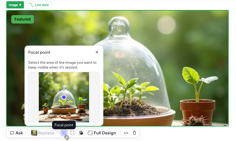 Tip: If the image has a Live data label, the image comes from a dynamic source such as a CMS collection. Go to the relevant source or ask the AI chat if you need to replace the image. Learn more about editing dynamic content in Wix Vibe. - Focal point: Select the area of the image you want to keep visible when it's resized.
