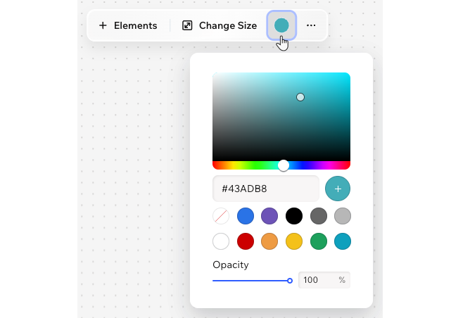 To pick a new color, move the dot on the color scheme or enter the color's hex code (e.g. #000000 for black). Once you found your color, click or tap the Add icon + to save it to your project's colors. You can also use the slider to adjust the color's opacity.
