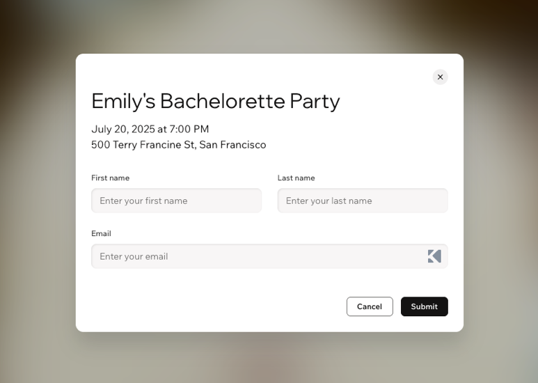 Bring your event to life with a beautiful online invitation, complete with an RSVP page, designed and managed entirely in Wixel. Generate an invitation with AI, customize the look, add interactive features, and manage guest responses with ease.