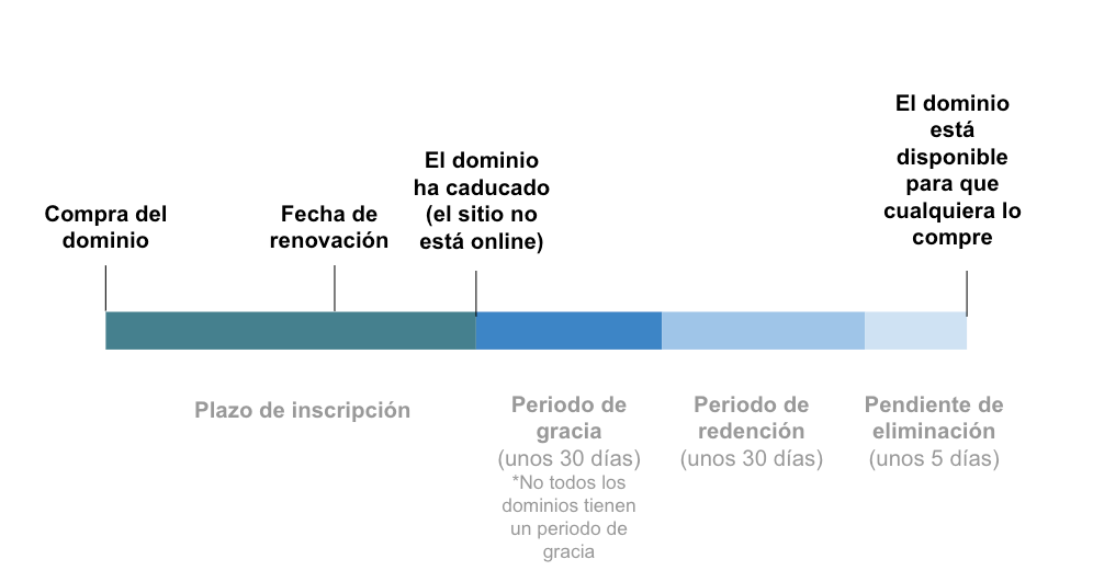 Hay algunas terminaciones de dominio que no tienen periodo de gracia. Estos dominios entrarán en el periodo de redención en la fecha de vencimiento del dominio. Más información sobre las terminaciones de dominios que no tienen periodo de gracia.