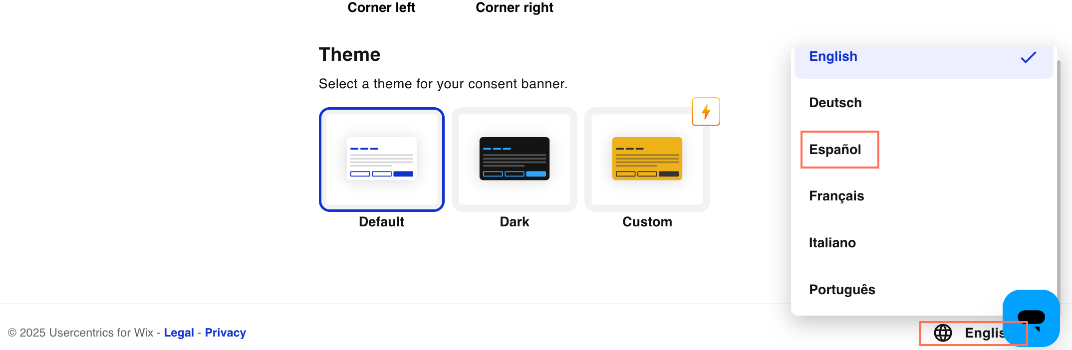 Nota: Para cambiar el idioma que ves en el panel de control en Banner de consentimiento de cookies, desplázate hacia abajo y haz clic en English, luego, selecciona Español.