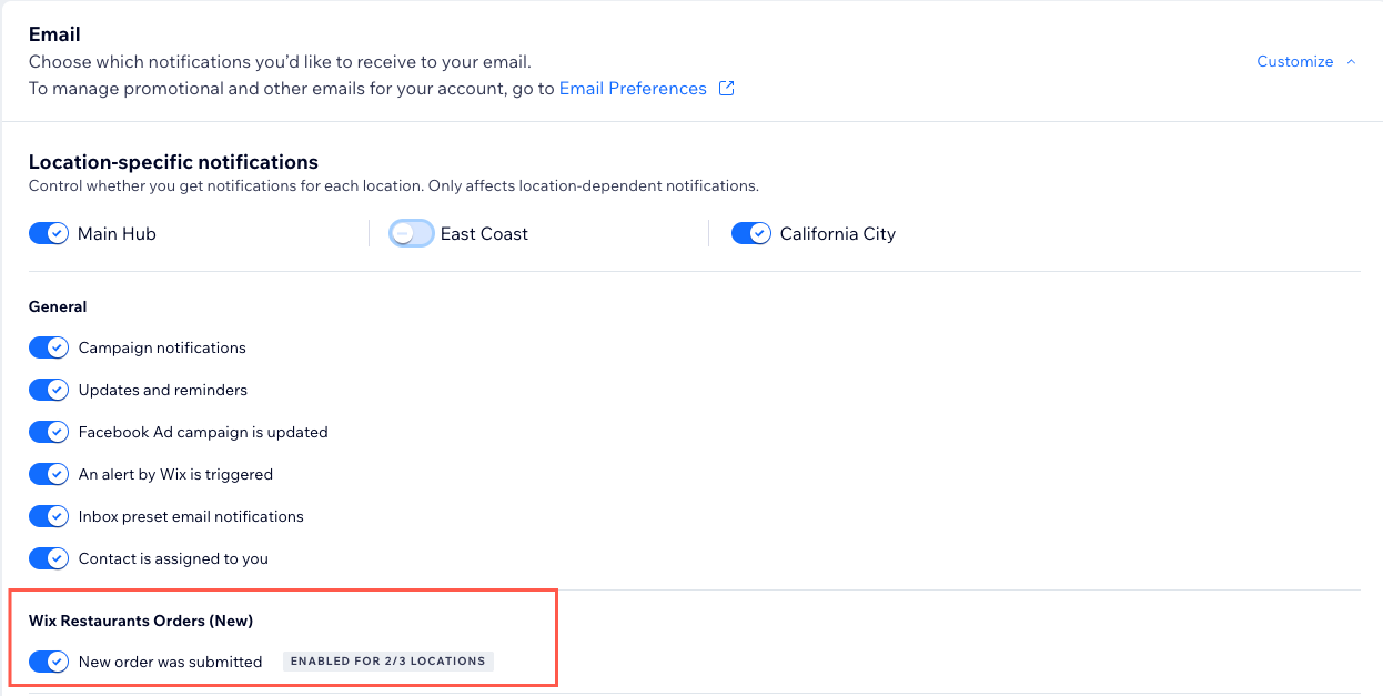 באפשרותכם לנהל את כל ההתראות של האתר במקום אחד, ולבחור אילו עדכונים לקבל מהדאשבורד ומאפליקציית Wix. זה כולל הודעות חשובות על הזמנות, למשל כאשר נכנסת הזמנת אוכל חדשה.