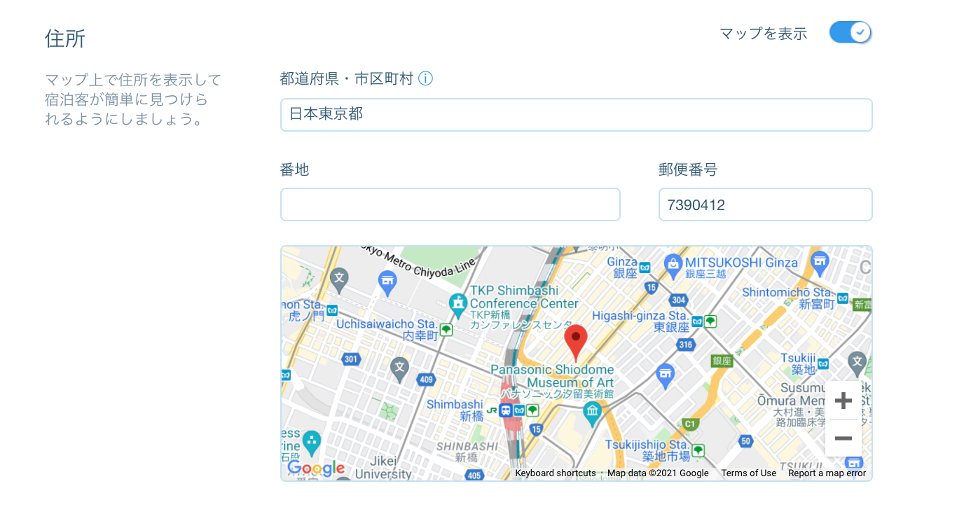 をクリックし、新たに客室を作成する場合は「+新しく追加」をクリックします。 - 「住所」セクションまでスクロールダウンします。