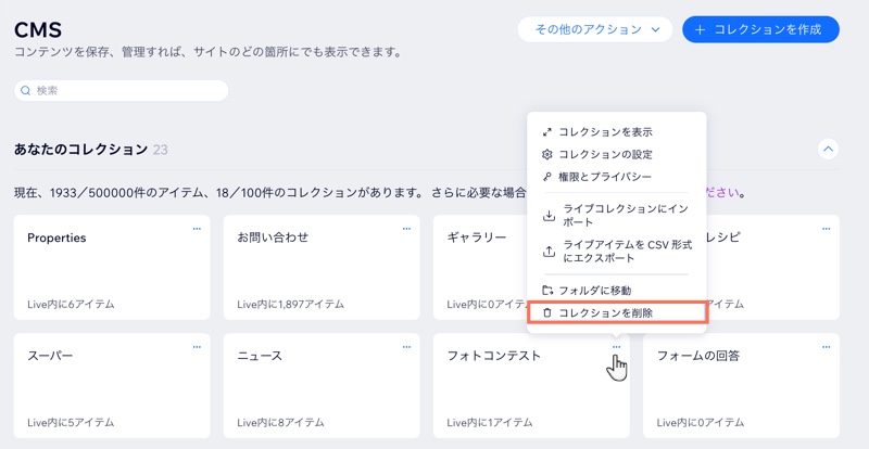 不要になったコレクションはいつでも削除することができます。削除するコレクションがページまたはサイト要素に接続されている場合は、削除すると接続も解除されます。