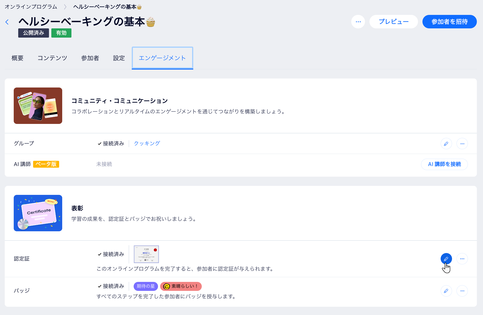 オンラインプログラムを修了した参加者に授与する認定証を作成します。認定証のデザインはカスタマイズでき、独自の署名やロゴを追加することも可能です。プログラムを修了した参加者に達成感を感じてもらえるよう、本格的な認定証を作成しましょう。