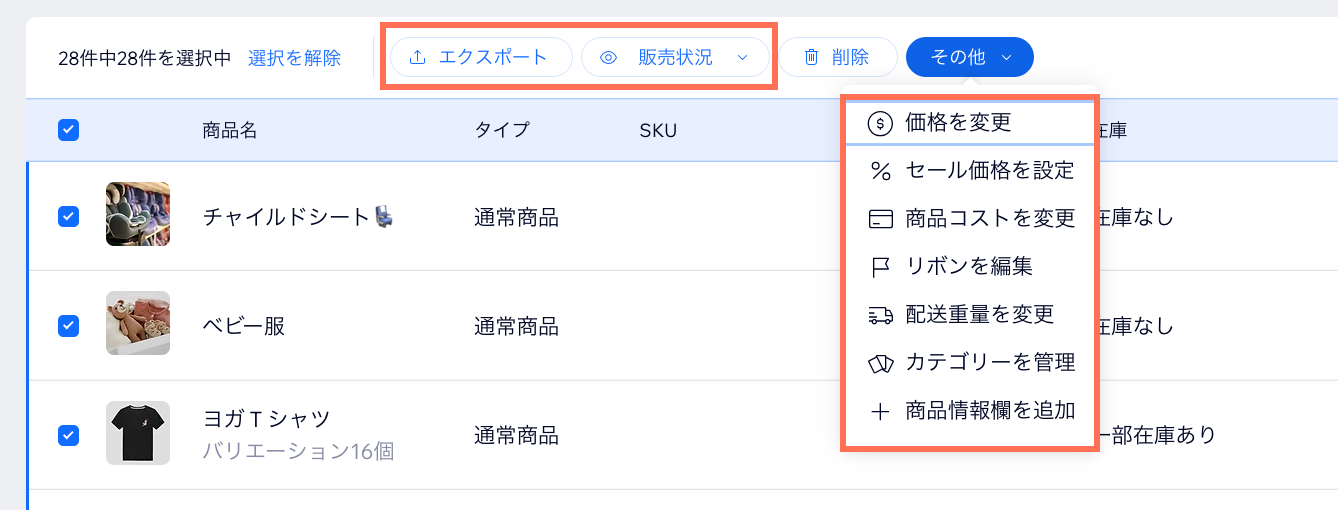 サイトダッシュボードの「ストアの商品」タブから直接さまざまな変更を加え、時間を節約しましょう。基本価格の変更、セール価格の設定、商品情報欄に同じ内容のコンテンツを追加するなどの操作が可能です。