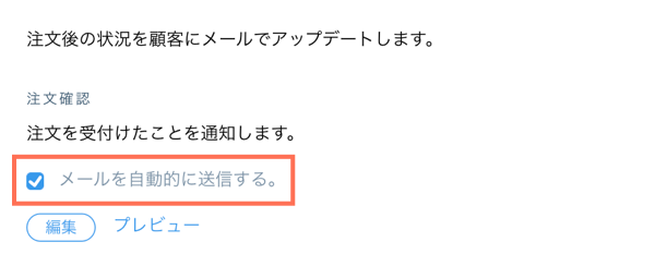 Eコマース設定から、顧客に送信される注文通知メールを確認できます。また、注文の受注または発送時にメールを自動的に送信するかどうかを設定することもできます。