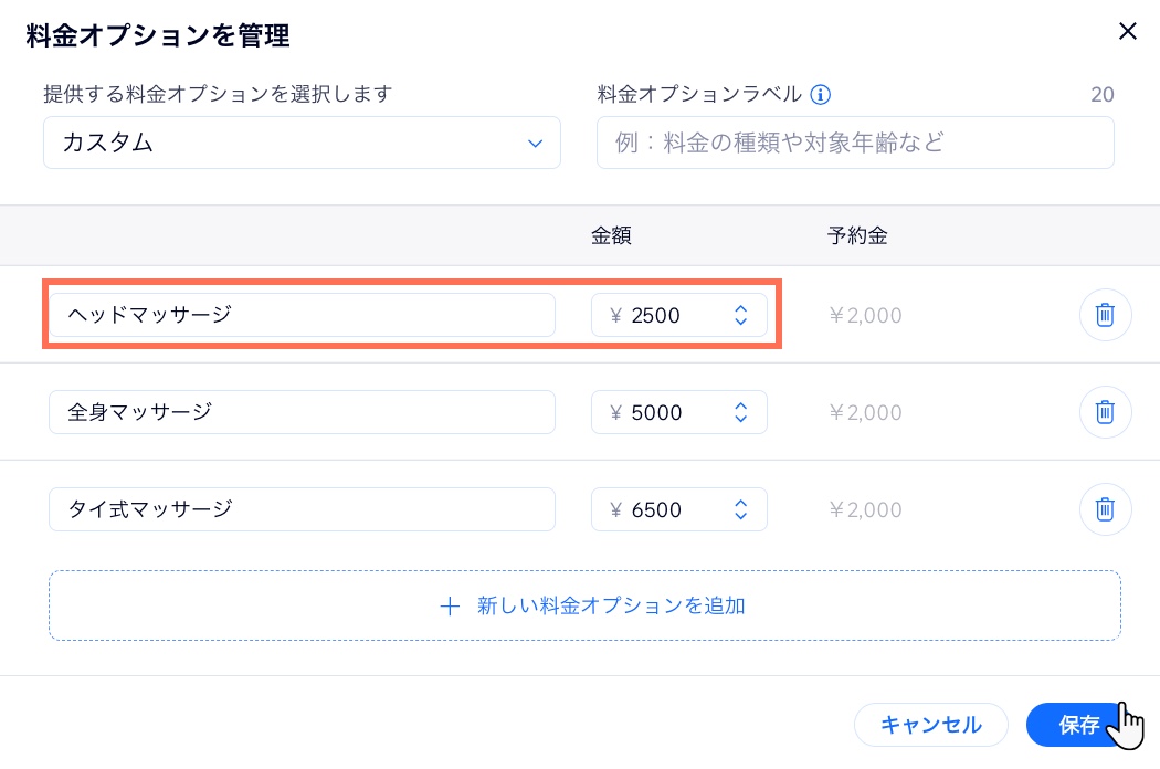 料金オプションを使用すると、さまざまな条件に基づいてサービスの料金を設定することができます。あなたのビジネス、スタッフ、顧客などに合わせ、各サービスに独自の価格オプションを作成できます。
