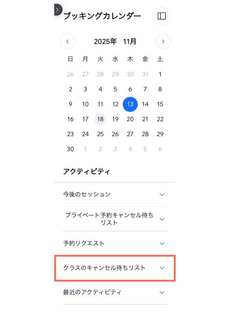 左側の「アクティビティ」パネルで、クラスのキャンセル待ちをすばやく確認することができます。これにより、クラスのキャンセル待ちをしているユーザーを一目で確認することができます。