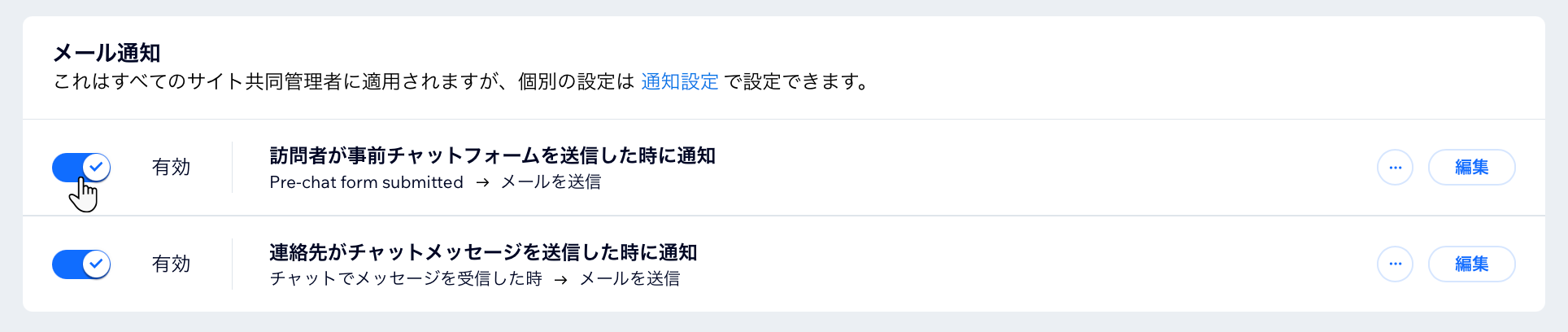 サイトのダッシュボードで、すべてのサイト共同管理者に対して管理できる特定の通知設定があります。これらの設定では、すべてのユーザーが新着メールと Wix チャットメッセージの通知を受信するかどうかを制御することができます。