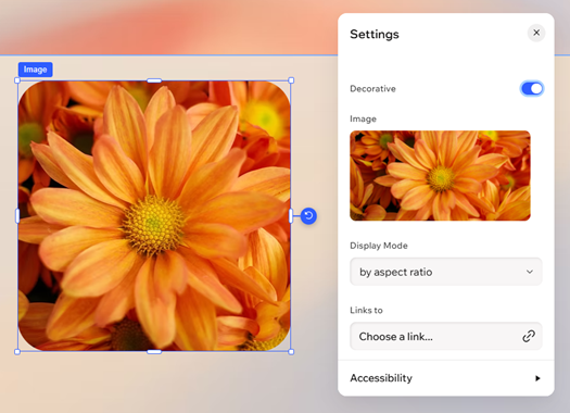 サイト上での画像の表示と動作に関する設定をカスタマイズします。画像を装飾目的としてマークしたり、表示モードを設定したり、アクセシビリティのために代替テキストを追加したり、画像がクリックされた際のリンク先を指定したりすることができます。