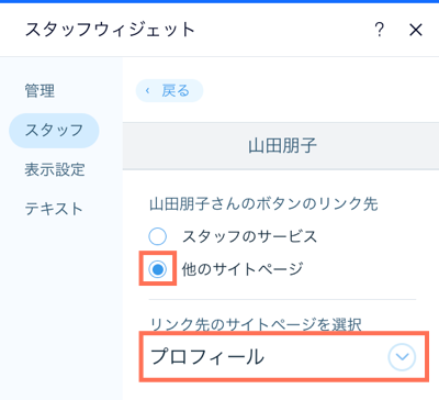 - 別のサイトページ:ドロップダウンをクリックし、リンクさせたいページを選択します。
