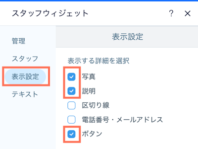 スタッフウィジェットのプロフィールで、表示または非表示にする詳細を選択します。写真、説明、電話番号・メールアドレスなどの要素を表示させることができます。