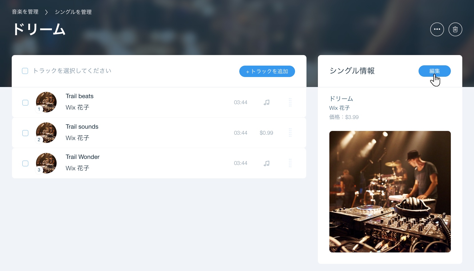 Wix ミュージックを使用すると、音楽を無料で共有し、オンラインで広めることができます。Wix ミュージックプレーヤーをサイトに追加し、表示するトラック、プレイリスト、アルバムを選択できます。また、訪問者が音楽をシェア・ダウンロードできるかどうかを制御することもできます。