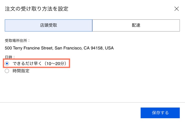 - 顧客が注文を受け取るまでの時間を指定します。