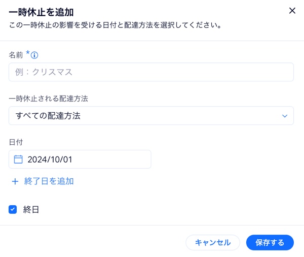 配達・お持ち帰り設定では、受け渡し時間、配達地域、最低注文金額、配達料金を指定することができます。休日や終日休みの場合は、一時休止を設定したり、注文を完全にブロックしたり、特定の受け渡し方法方法をブロックしたりすることもできます。