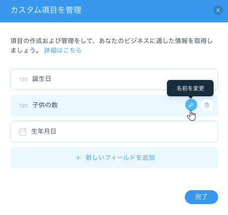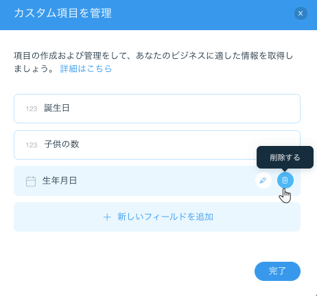 ここからカスタム項目を削除したり、名前を変更したりすることもできます。変更はすべての連絡先に適用されます。項目を削除すると、その項目で収集したデータも削除されます。