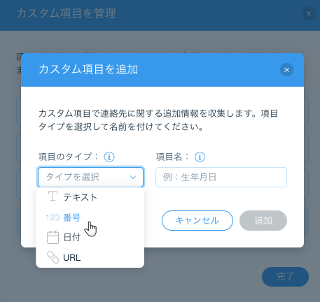 連絡先リストにカスタム項目を追加して、連絡先に関する追加情報を保存しましょう。カスタム項目はテキスト、番号、日付、URL のいずれかで、任意の名前を付けることができます。