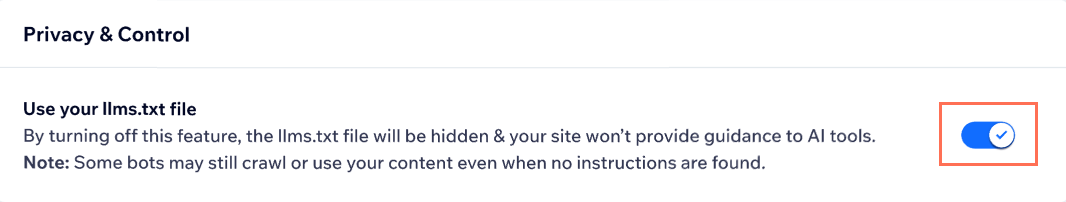Als je je LLMs.txt-bestand wilt verbergen en wilt voorkomen dat je website AI-tools begeleidt, klik je op de schakelaar onder Privacy en controle om je af te melden.