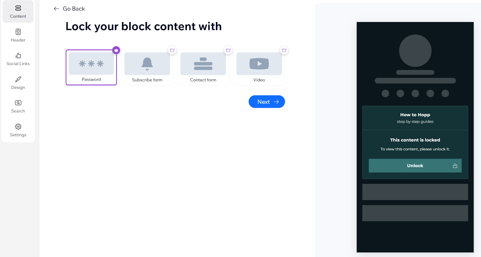 Met de vergrendelfunctie kun je bepalen wie toegang heeft tot specifieke blokken op je Link in Bio- of Instant-pagina's. Je kunt volledige toegang vergrendelen of de call to action-knop beperken totdat aan bepaalde voorwaarden is voldaan.