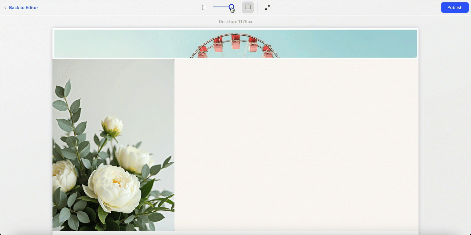 Terwijl je aanpassingen aanbrengt, is het belangrijk om ervoor te zorgen dat het ontwerp er goed uitziet voordat je live gaat. Klik rechtsboven in de editor op Voorbeeld. Sleep dan de schuifregelaar bovenaan om het scherm kleiner te maken en te zien hoe je ontwerp live wordt aangepast — niet alleen voor mobiel, maar ook voor tablets.