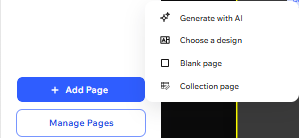 - Genereren met AI: Krijg pagina-ideeën en laat AI je pagina maken. Bekijk de voorgestelde paginatypes in de chat en kies het type dat je wilt toevoegen. Je kunt ook je eigen beschrijving schrijven van de pagina die je voor ogen hebt.