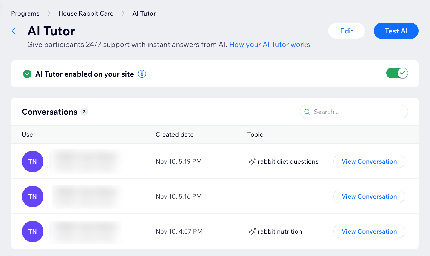 Blijf op de hoogte van veelgestelde vragen of problemen door de interacties van deelnemers met de AI-docent te volgen.