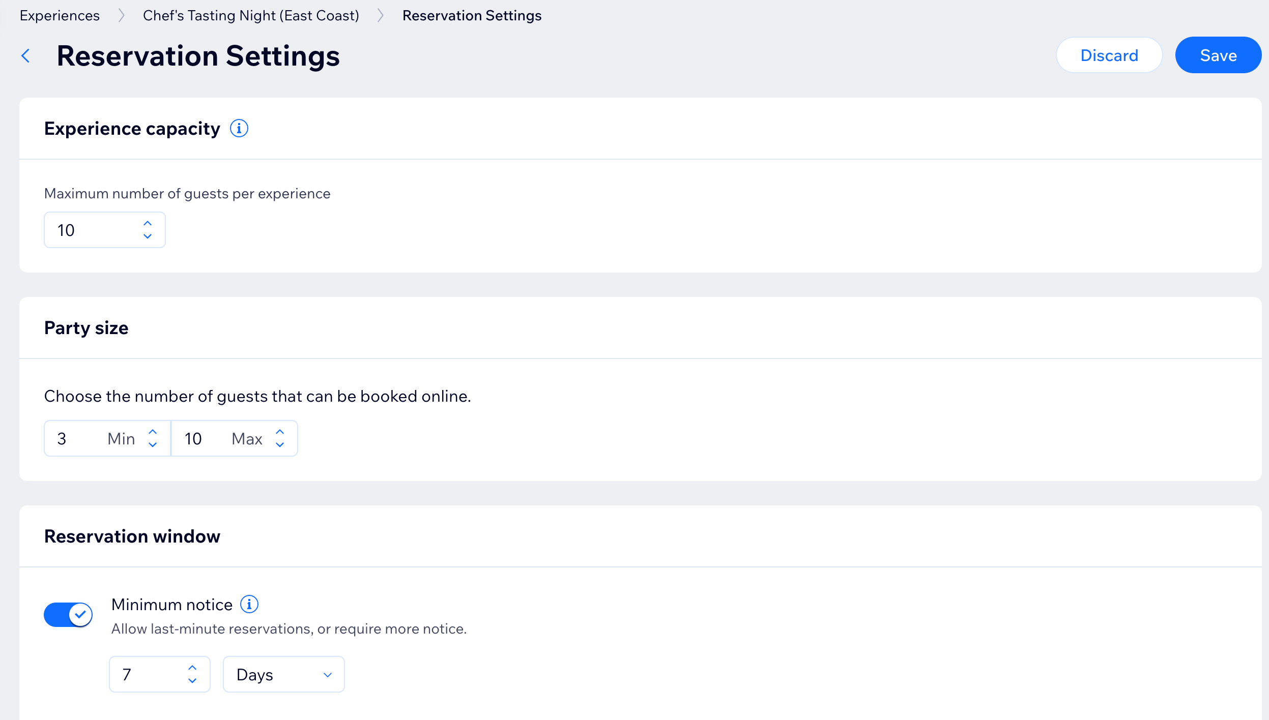 Je kunt ook belangrijke details definiëren, zoals het maximum aantal gasten per tijdvak, limieten voor de groepsgrootte en hoe ver van tevoren gasten kunnen reserveren.