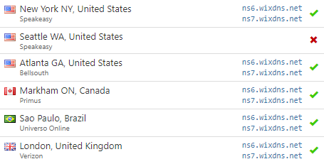 Use o whatsmydns.net para verificar se o seu domínio possui os registros corretos do servidor de nomes Wix em vários locais do mundo.