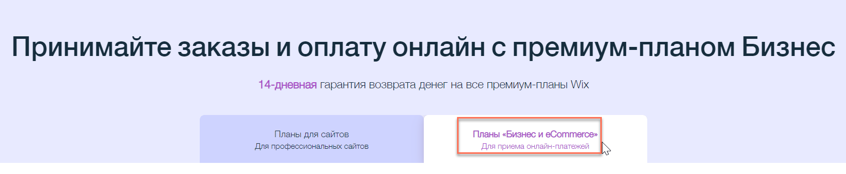 Wix предлагает 3 разных плана, специально разработанных для бизнеса. Чтобы начать принимать заказы и онлайн-платежи, перейдите на премиум-план «Бизнес и eCommerce», который лучше всего подходит для вашего бизнеса.