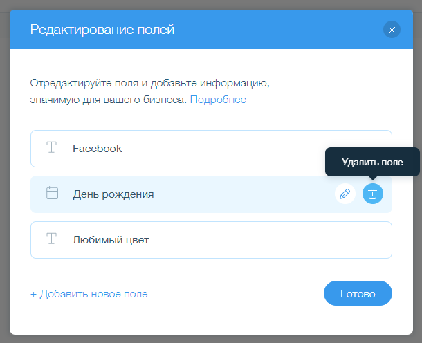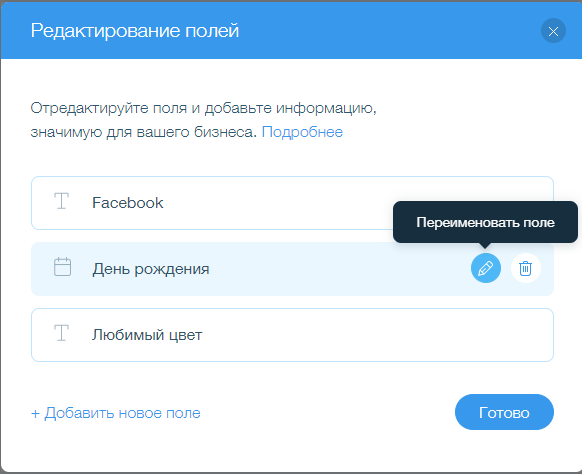 Здесь вы можете удалить или переименовать свои поля. Изменения будут применены ко всем вашим контактам. Если вы удалите поле, данные собранные через это поле также будут удалены.