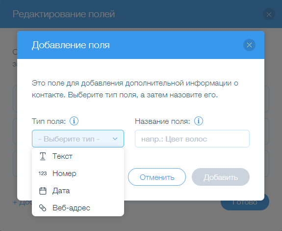 Здесь вы можете добавить новое поле контакта, чтобы собирать дополнительную информацию. Поля будут добавлены ко всем вашим контактам.