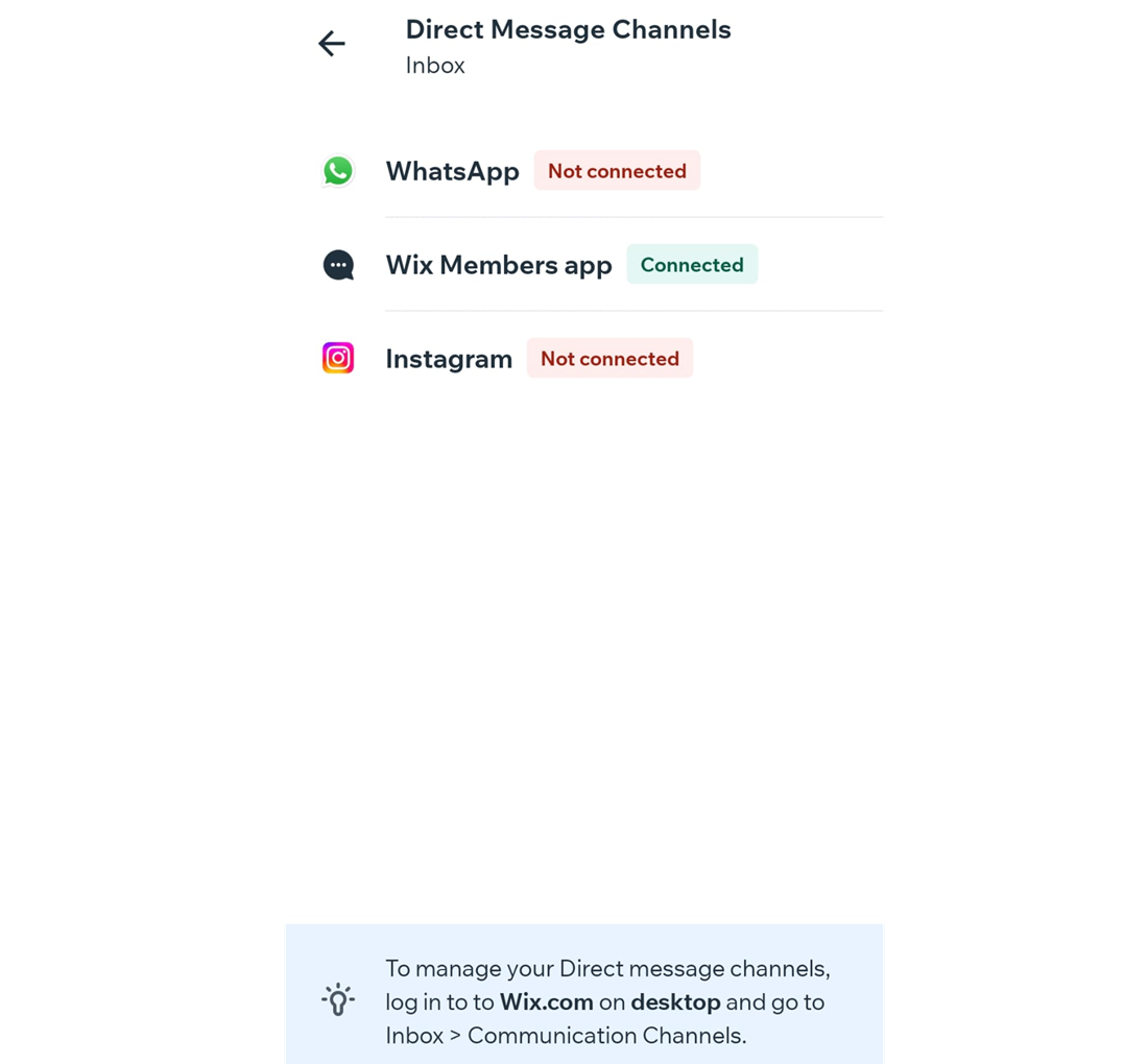 Wix Gelen Kutusu'na aşağıdaki iletişim kanalı türlerini bağlayabilir ve yönetebilirsiniz: